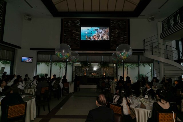 お二人の披露宴入場前にオープニングムービーで盛り上がる中