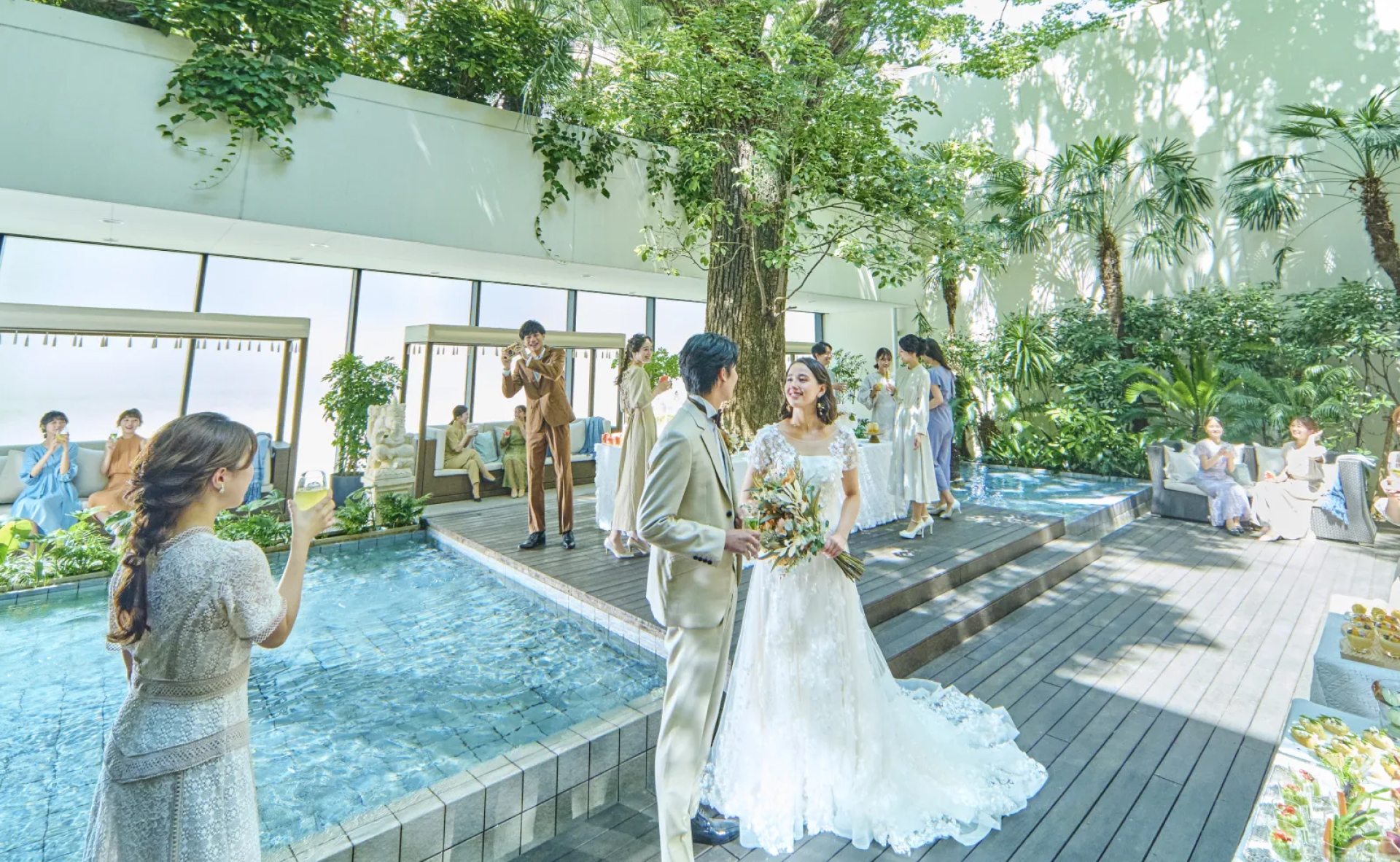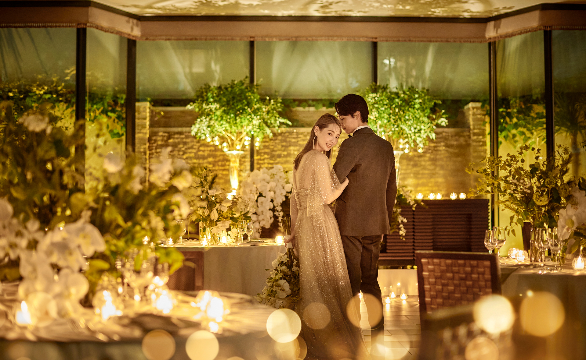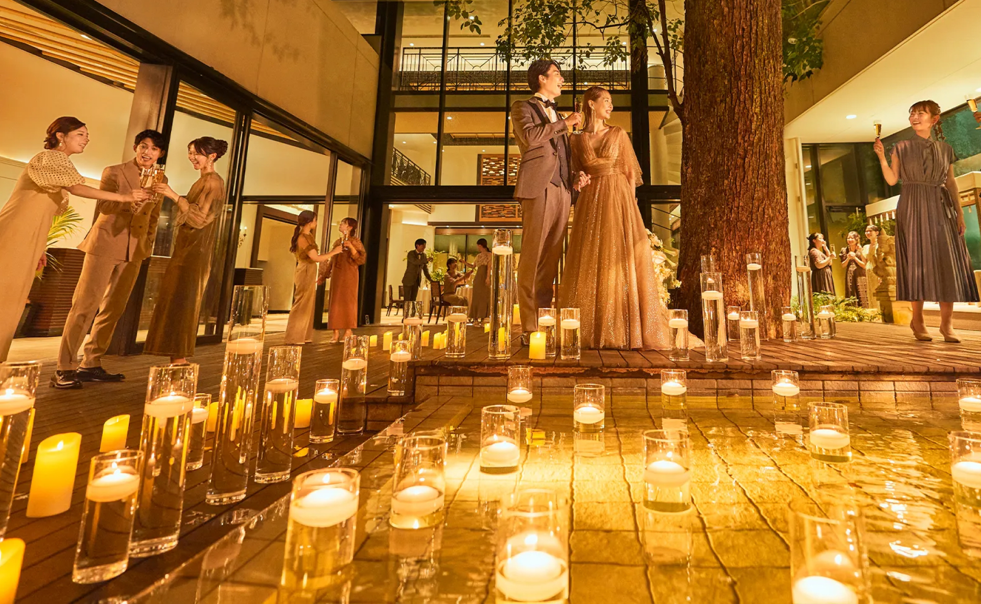 会場に隣接するガーデンはゆったり広々。オリエンタルな雰囲気のインテリアが神秘的な空気を醸し出しています。心地よい水のせせらぎや樹齢300年の大クスノキが見守るガーデンで、ゲストとご歓談や写真タイムをお楽しみください。