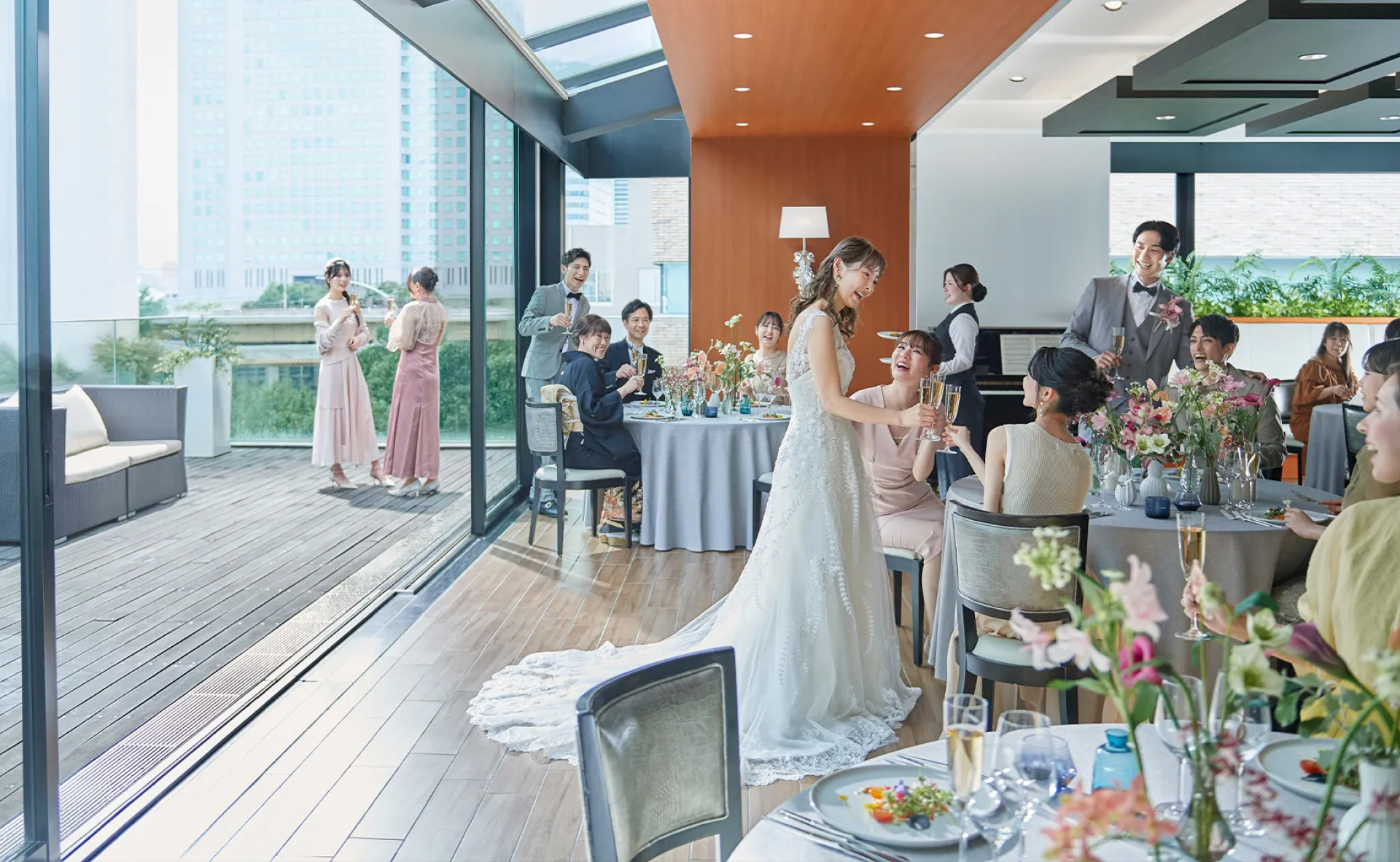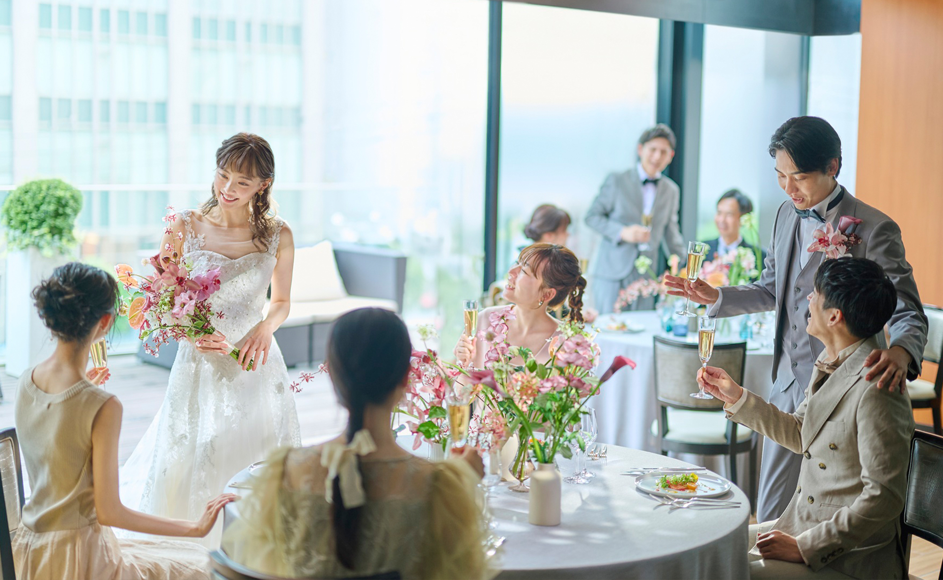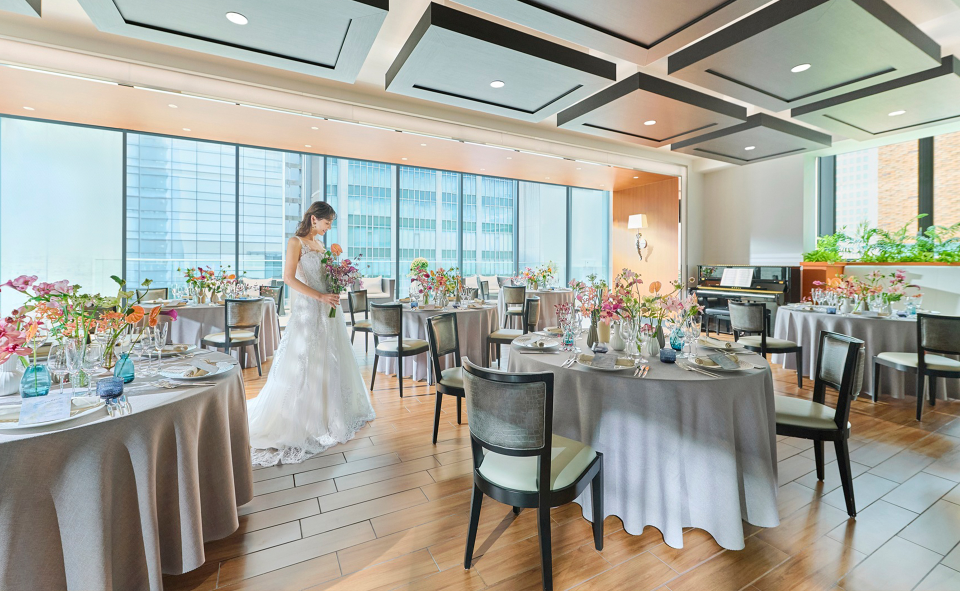 テラスから射し込む温かい自然光やフォトスポットにもなる緑の木々が、都心とは思えないほどのゆとりとくつろぎを感じさせてくれます。ラグジュアリーな趣と自然が一体となった特別なステージで、ゲストと心温まるひと時を。