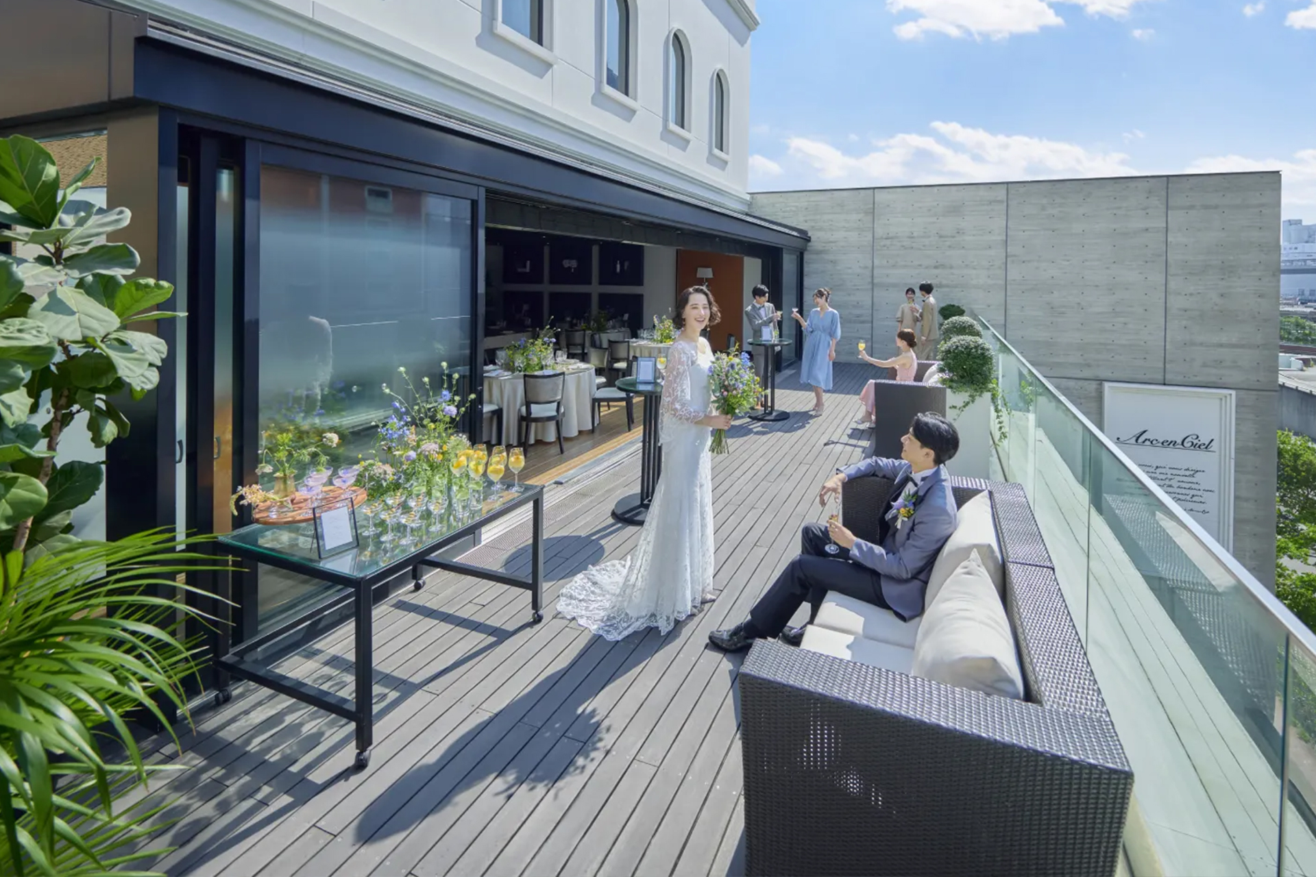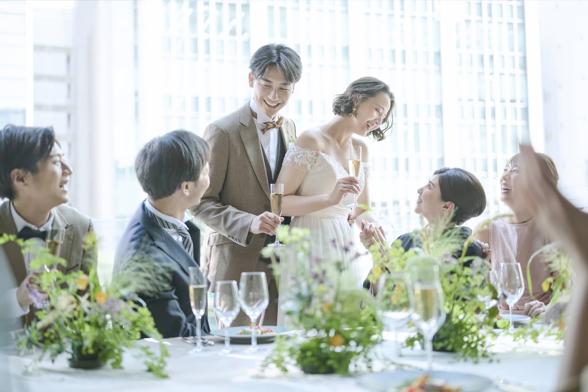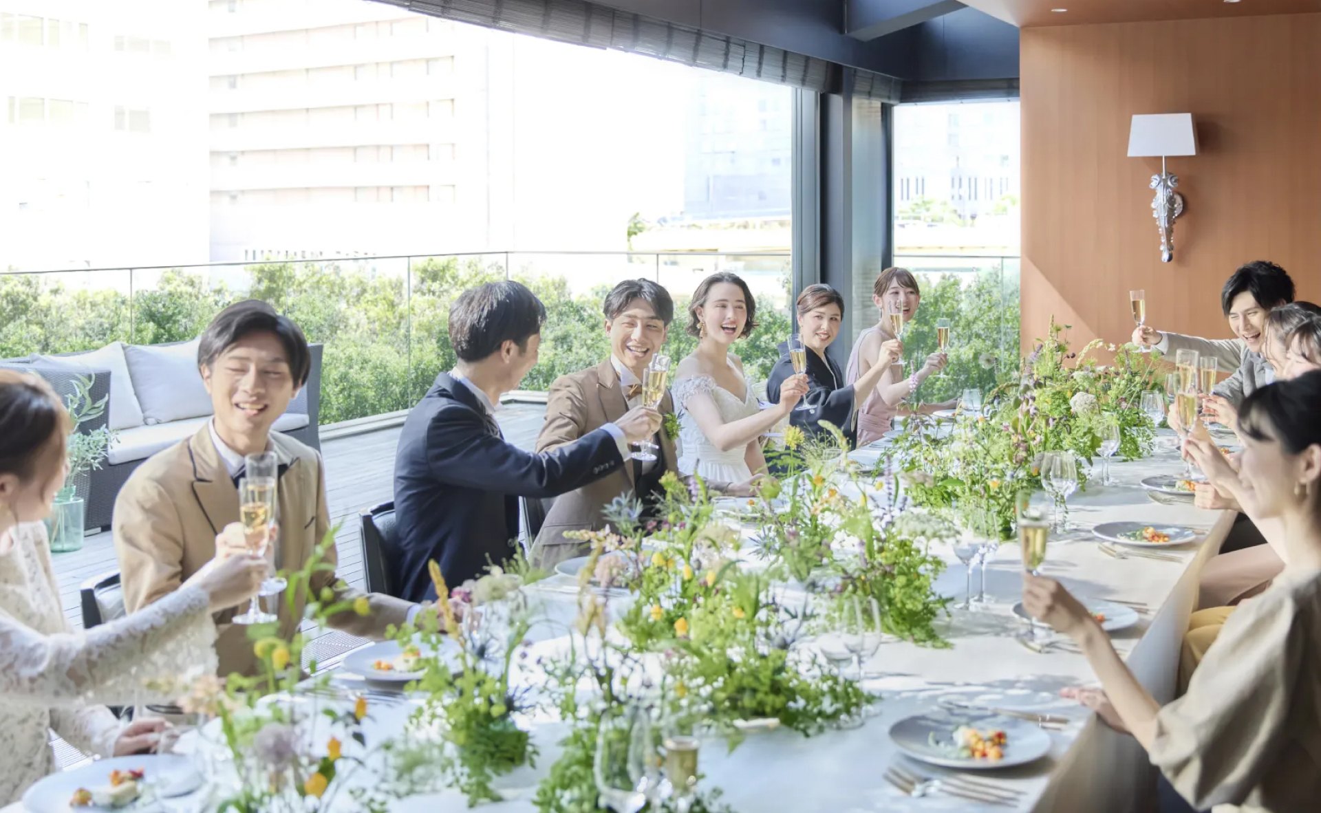 テラスから射し込む温かい自然光やフォトスポットにもなる緑の木々が、都心とは思えないほどのゆとりとくつろぎを感じさせてくれます。ラグジュアリーな趣と自然が一体となった特別なステージで、ゲストと心温まるひと時を。